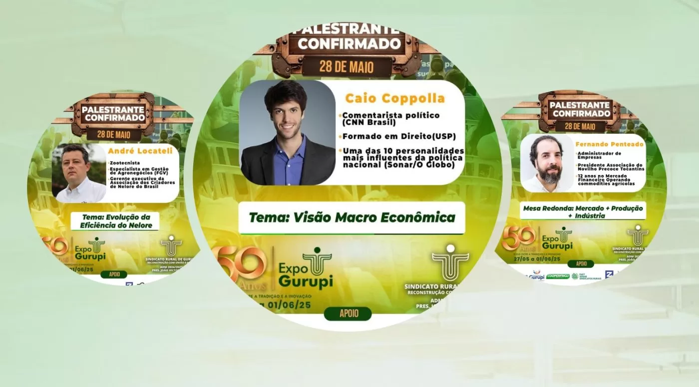 A Expo Gurupi 2025 segue se consolidando como um dos maiores eventos agropecuários do Tocantins e do Brasil. Em comemoração aos 50 anos da feira, a programação do dia 28 de maio contará com três grandes nomes: o comentarista político Caio Coppolla, o administrador de empresas Fernando Penteado e o zootecnista André Locateli.